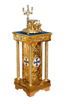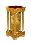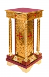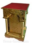 Классический вариант представляет из себя высокую тумбу на витой латунной ножке. Более современные варианты изготовляются из дерева и украшаются замысловатыми резными узорами. Наша мастерская может изготовить практически любую подставку под иконы по фото или эскизу. Кроме того возможно индивидуальное изготовление практически любой храмовой мебели, заказ исполняется на протяжении двух недель.