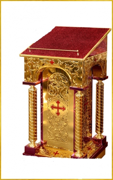 розміри (Д х Ш х В): 50 x 50 x 105 см; чеканка; метал - булат (нержавіюча сталь з напиленням нітриду титану); нерозбірний; кришка - оксамит (меблева тканина); основа аналою: ДСП - 16 мм.