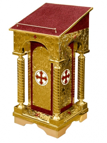 розміри (Д х Ш х В): 50 x 50 x 105 см; чеканка; метал - булат (нержавіюча сталь з напиленням нітриду титану); нерозбірний; кришка - оксамит (меблева тканина); основа аналою: ДСП - 16 мм.