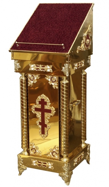 лиття, литі ніжки; розміри (Д х Ш х В): 45 х 45 х 120 см; метал — булат (нержавіюча сталь з напиленням нітриду титану); розбірний; кришка — оксамит (меблева тканина); основа аналоя: вологостійка фанераНет описания