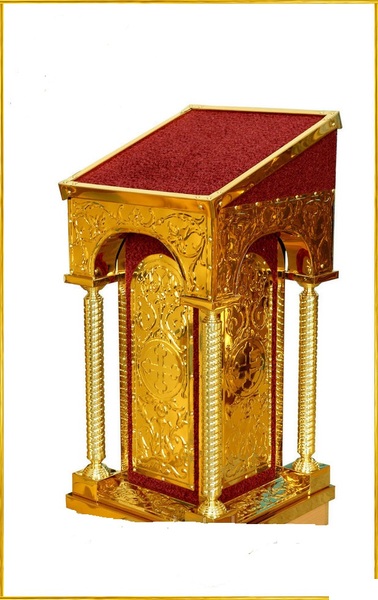 розміри (Д х Ш х В): 50 x 50 x 105 см; чеканка; метал - булат (нержавіюча сталь з напиленням нітриду титану); нерозбірний; кришка - оксамит (меблева тканина); основа аналою: ДСП - 16 мм