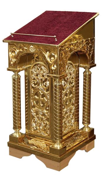 чеканка; металл — булат (нержавеющая сталь с напылением нитрида титана); неразборный; крышка — бархат (мебельная ткань); основа аналоя: ДСП — 16 мм.Розмер :