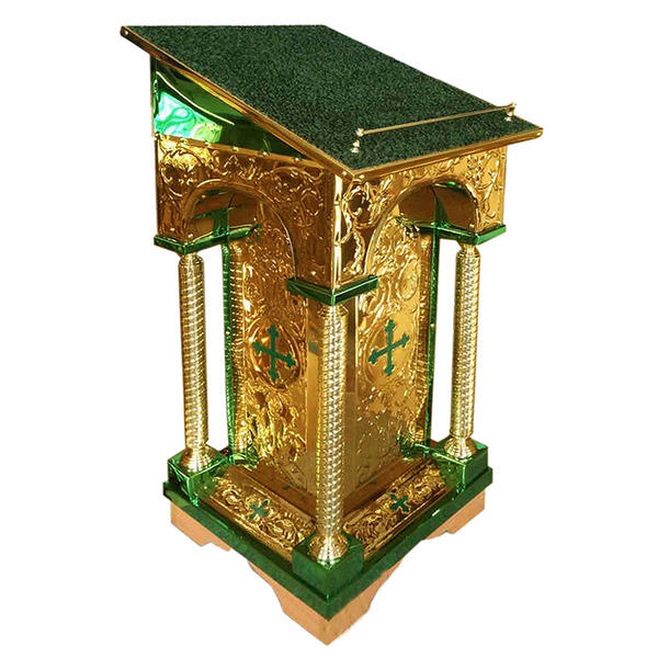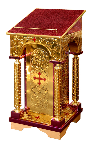 Размер: 50*50*105 см. Булат, чеканка, неразборный.Основа аналоя - ДСП - 16 мм. Металл - булат (нержавеющая сталь с напылением нитрид титана). Крышка - бархат (мебельная ткань)Нет описания