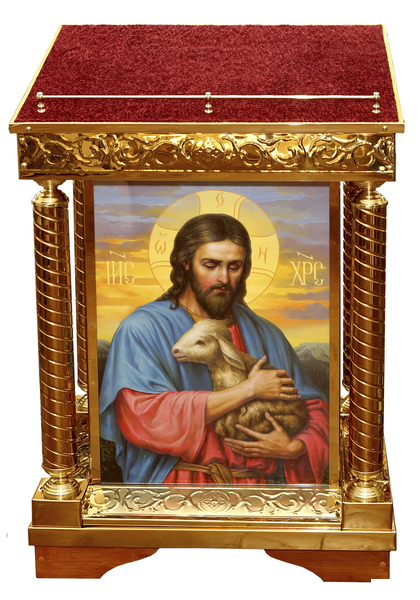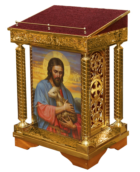 чеканка; металл — булат (нержавеющая сталь с напылением нитрида титана); неразборный; крышка — бархат (мебельная ткань); основа аналоя: ДСП — 16 мм.Розмер :