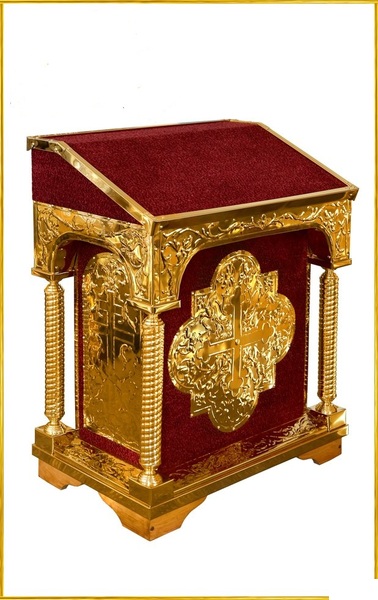 розміри (Д х Ш х В): 85 х 55 х 105 см; чеканка; метал — булат (нержавіюча сталь з напиленням нітриду титану); нерозбірний; кришка - оксамит (меблева тканина); основа аналою: ДСП - 16 мм.