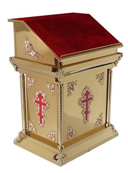 Размер: 60*80*112 см. Булат, литье, разборный.Основа аналоя - влагостойкая фанера. Металл - булат (нержавеющая сталь с напылением нитрид титана). Крышка - бархат (мебельная ткань)Нет описания
