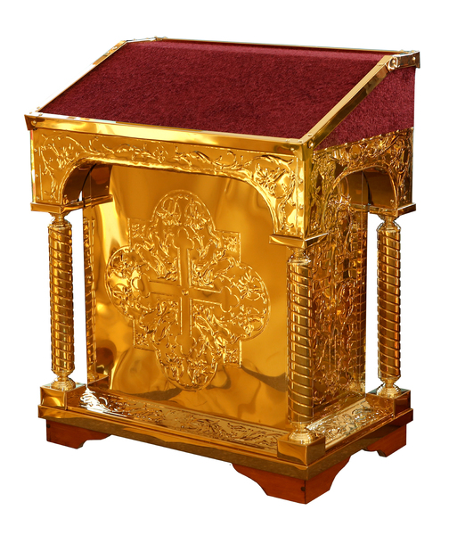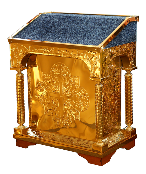Размер: 85*55*105 см. Булат, чеканка, неразборный.Основа аналоя - ДСП -16 мм. Металл - булат (нержавеющая сталь с напылением нитрид титана). Крышка - бархат (мебельная ткань)Нет описания