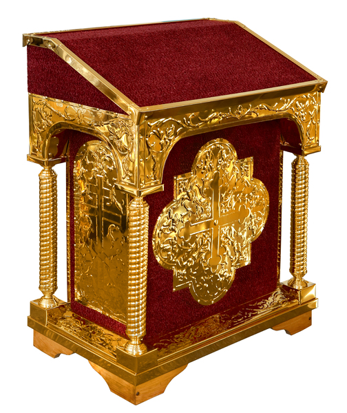 Размер: 85*55*105 см. Булат, чеканка, неразборный.Основа аналоя - ДСП -16 мм. Металл - булат (нержавеющая сталь с напылением нитрид титана). Крышка - бархат (мебельная ткань)