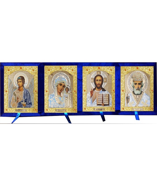 • Бархатный складень четверной ли 15х18 Софрино белая одежда Б-214-1-С с золотым окладом, замочком и вышитым крестиком по средине, 72х21х6 см