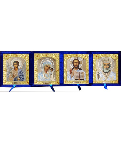 Бархатный складень четверной лик 10х12 Софрино белая одежда Б-224-1-С с золотым окладом, замочком и вышитым крестиком по средине, 52х15х6см