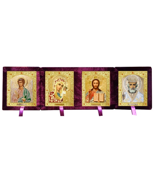 Бархатный складень четверной лик 10х12 Софрино цветная одежда Б-224-3-Б с золотым окладом, замочком и вышитым крестиком по средине, 52х15х6 см