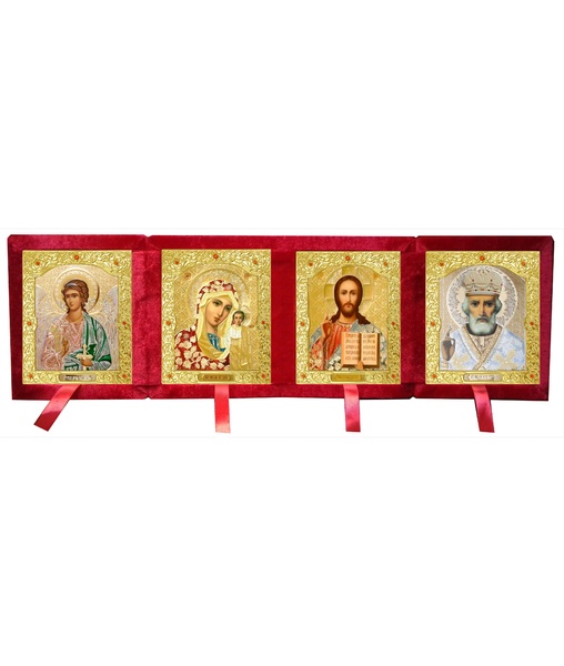 Бархатный складень четверной лик 10х12 Софрино цветная одежда Б-224-3-К с золотым окладом, замочком и вышитым крестиком по средине, 52х15х6 см
