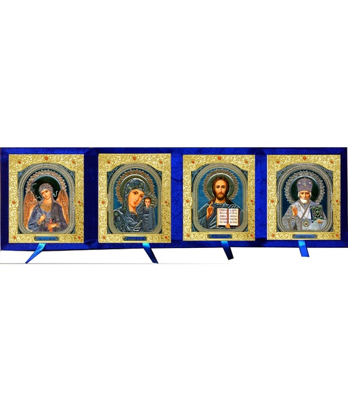 Бархатный складень четверной лик 10х12 Софрино узор Б-224-4-С с золотым окладом, замочком и вышитым крестиком по средине, 52х15х6 см