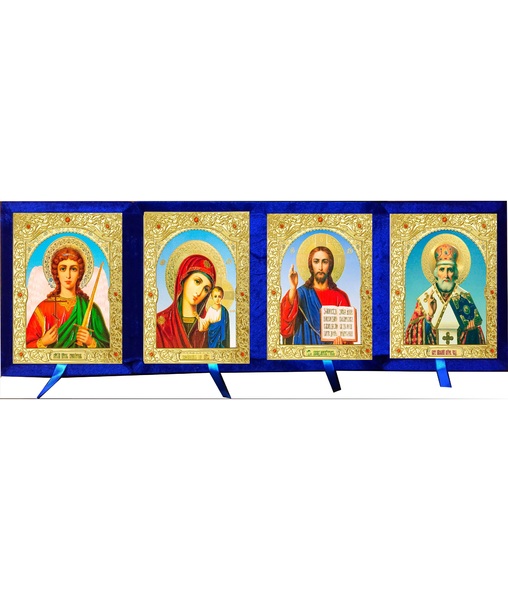 Бархатный складень четверной лик 15х18 Софрино арочный Б-214-6-С с золотым окладом, замочком и вышитым крестиком по средине, 72х21х6 см