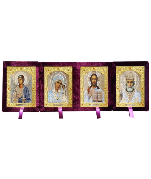 Бархатный складень четверной лик 15х18 Софрино белая одежда Б-214-1-Б с золотым окладом, замочком и вышитым крестиком по средине, 72х21х6 см