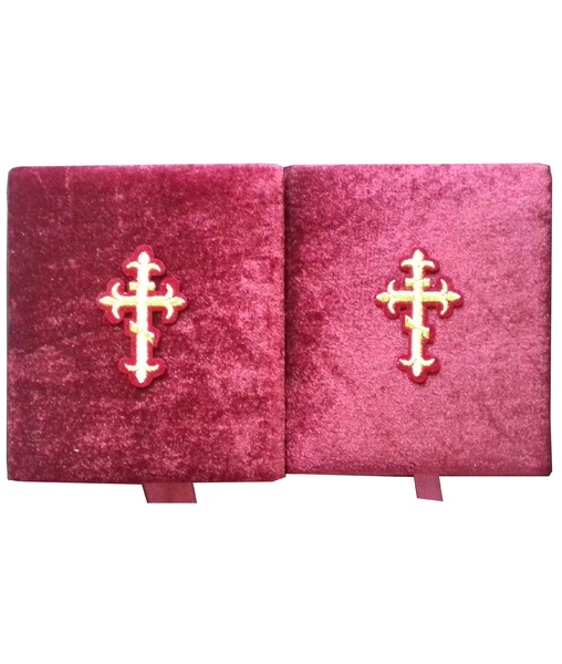 • Бархатный складень четверной лик 15х18 Софрино белая одежда Б-214-1-Б с золотым окладом, замочком и вышитым крестиком по средине, 72х21х6 см