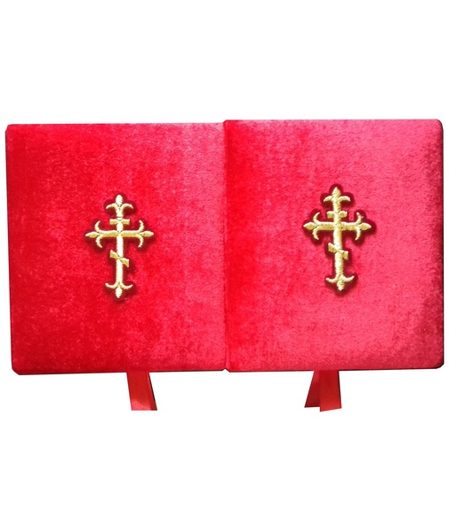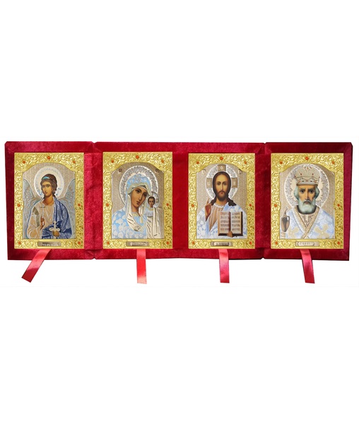 Бархатный складень четверной лик 15х18 Софрино белая одежда Б-214-1-К с золотым окладом, замочком и вышитым крестиком по средине, 72х21х6 см