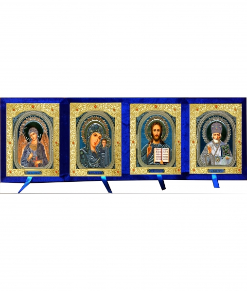 Бархатный складень четверной лик 15х18 Софрино узор Б-214-4-С с золотым окладом, замочком и вышитым крестиком по средине, 72х21х6 см