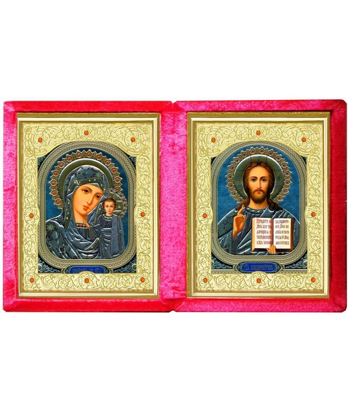 • Бархатный складень невынимающийся лик 15х18 Софрино узор Б-20-1-К c золотым окладом, замочком и вышитым крестиком по средине, 25х28х6 см