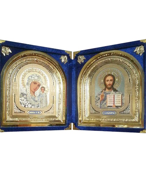 Бархатный складень с коваными угол., лик 15х18 невынимающийся Софрино узор Б-12-К-С c золотым окладом, замочком и вышитым крестиком по средине, 25х28х6 см