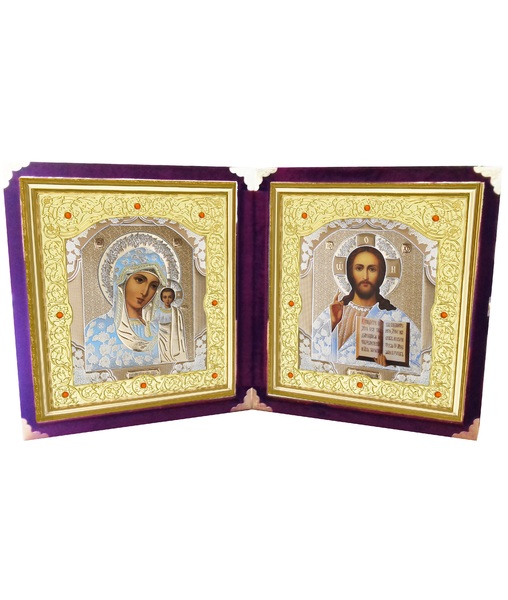 Бархатный складень с коваными угол.,лик 15х18 невынимающийся Софрино белая одежда Б-20-К-1-Б c золотым окладом, замочком и вышитым крестиком по средине, 25х28х6 см