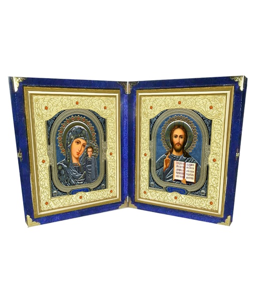 Бархатный складень с коваными уголочками, невынимающийся лик 15х18 Софрино узор Б-20-К-С c золотым окладом, замочком и вышитым крестиком по средине, 25х28х6 см