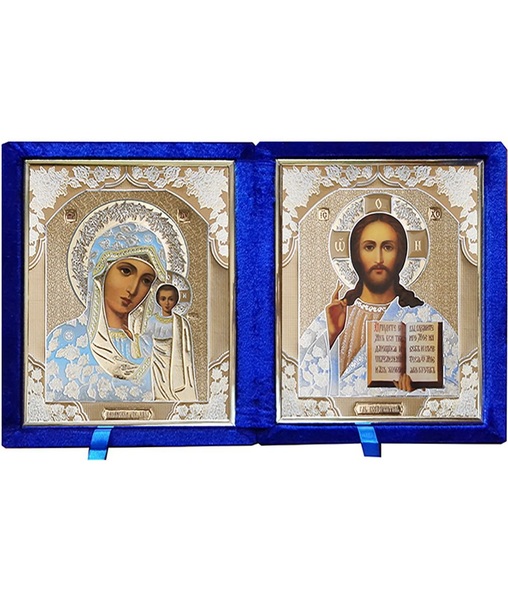 Бархатный складень с молдингом, лик 10х12 Софрино белая одежда Б-1012-ВМ-1-С вынимающийся, с замочком и вышитым крестиком, 26х15х3 см