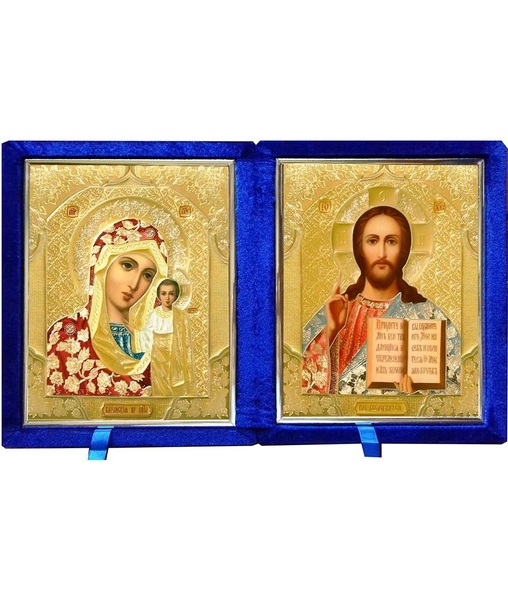 Бархатный складень с молдингом, лик 10х12 Софрино цветная одежда Б-1012-ВМ-2-С вынимающийся, с замочком и вышитым крестиком, 26х15х6 см