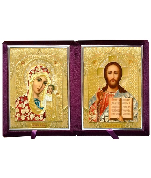 Бархатный складень с молдингом, лик 15х18 Софрино цветная одежда Б-1518-ВМ-2-Б вынимающийся, с замочком и вышитым крестиком, 36х21х6 см