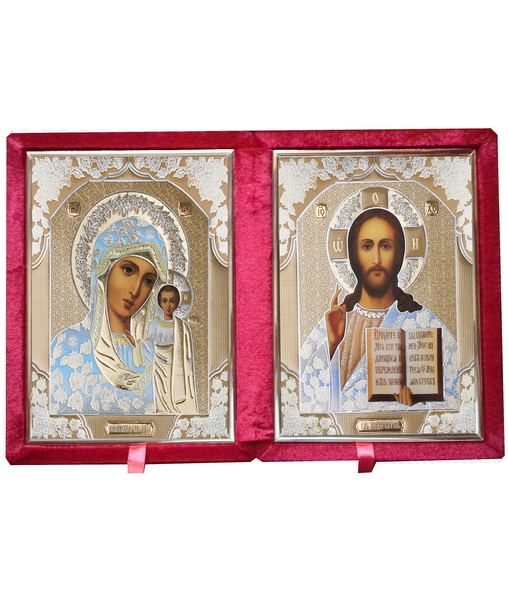 Бархатный складень с молдингом, лик 17х24 Софрино белая одежда Б-1724-ВМ вынимающийся, с замочком и вышитым крестиком, 40х27х6 см красная