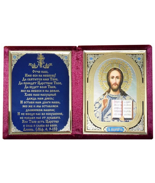 Бархатный складень с молитвой, вынимающийся лик 10х12 Софрино узор Б-22-М-1-Б вынимающийся с молдингом, замочком и вышитым крестиком по средине, 26х15х3 см