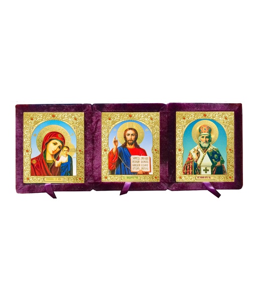 Бархатный складень тройной лик 10х12 Софрино арочный Б-223-6-Б с золотым окладом, замочком и вышитым крестиком по средине, 39х15х6 см