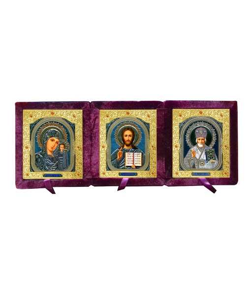 Бархатный складень тройной лик 10х12 Софрино узор Б-223-4-Б с золотым окладом, замочком и вышитым крестиком по средине, 39х15х6 см