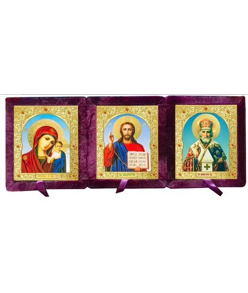 Бархатный складень тройной лик 15х18 Софрино арочный Б-213-6-Б с золотым окладом, замочком и вышитым крестиком по средине, 54х21х6 см