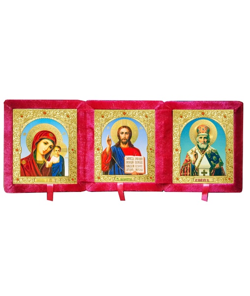 Бархатный складень тройной лик 15х18 Софрино арочный Б-213-6-К с золотым окладом, замочком и вышитым крестиком по средине, 54х21х6 см