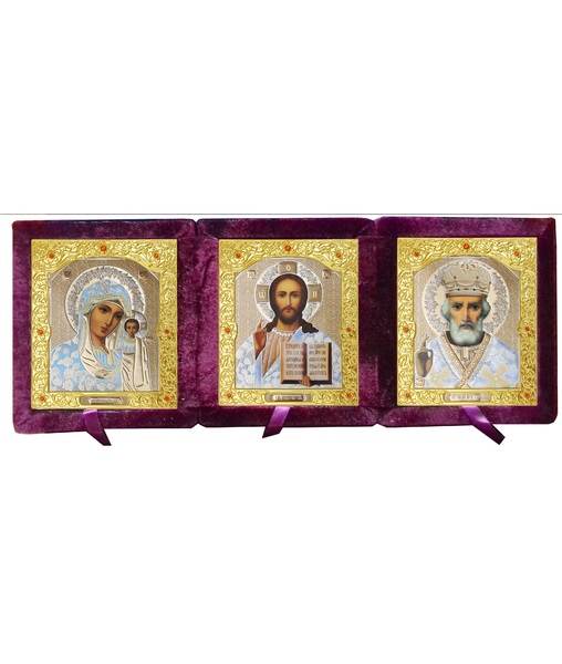 Бархатный складень тройной лик 15х18 Софрино белая одежда Б-213-1-Б с золотым окладом, замочком и вышитым крестиком по средине, 54х21х6 см