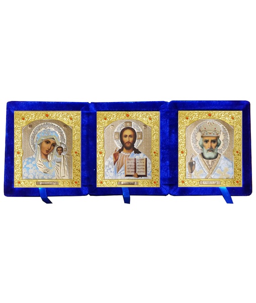 Бархатный складень тройной лик 15х18 Софрино белая одежда Б-213-1-С с золотым окладом, замочком и вышитым крестиком по средине, 54х21х6 см