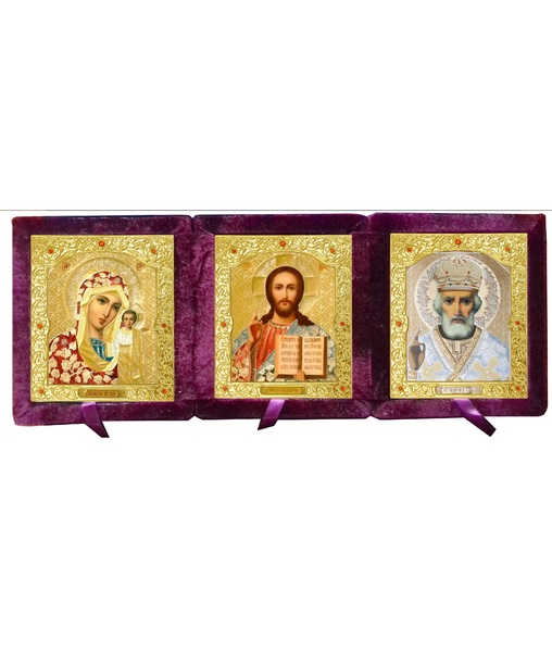 Бархатный складень тройной лик 15х18 Софрино цветная одежда Б-213-3-Б с золотым окладом, замочком и вышитым крестиком по средине, 54х21х6 см