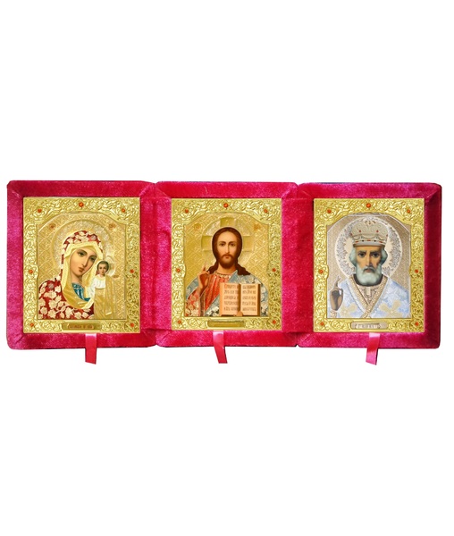 Бархатный складень тройной лик 15х18 Софрино цветная одежда Б-213-3-К с золотым окладом, замочком и вышитым крестиком по средине, 54х21х6 см