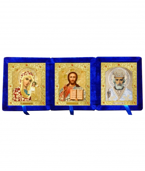 Бархатный складень тройной лик 15х18 Софрино цветная одежда Б-213-3-С с золотым окладом, замочком и вышитым крестиком по средине, 54х21х6 см