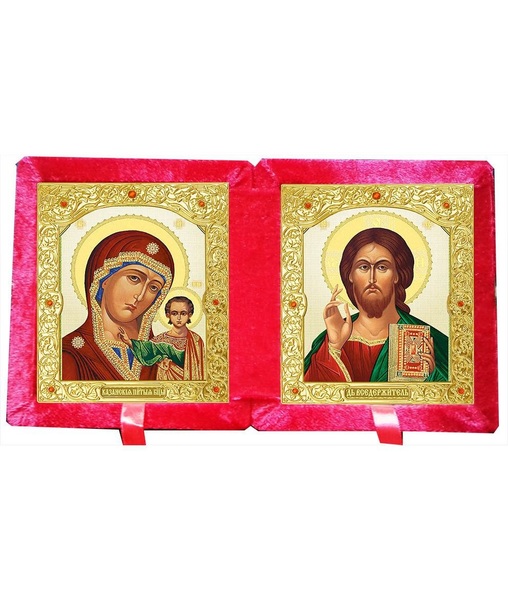 Бархатный складень вынимающийся лик 10х12 Софрино арочный Б-22-6-К с золотым окладом, замочком и вышитым крестиком по средине, 26х15х3 см