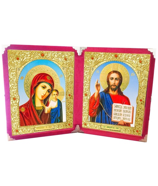 Бархатный складень вынимающийся лик 10х12 Софрино арочный Б-22-К-6-К с коваными уголочками, золотым окладом, замочком и вышитым крестиком по средине, 26х15х3 см