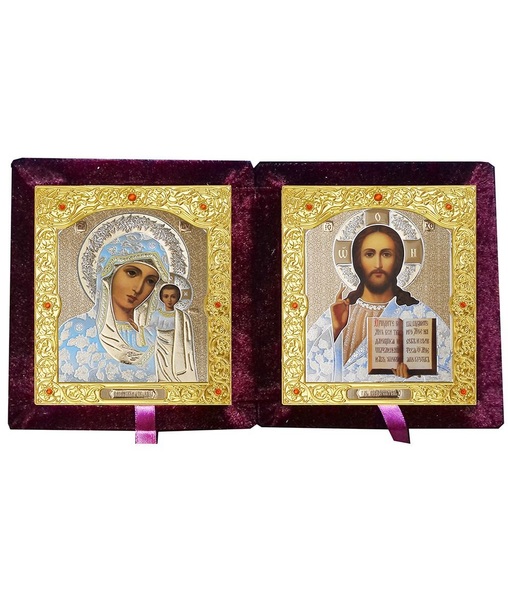 Бархатный складень вынимающийся лик 10х12 Софрино белая одежда Б-22-1-Б с золотым окладом, замочком и вышитым крестиком по средине, 26х15х3 см