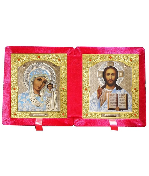 Бархатный складень вынимающийся лик 10х12 Софрино белая одежда Б-22-1-К с золотым окладом, замочком и вышитым крестиком по средине, 26х15х3 см