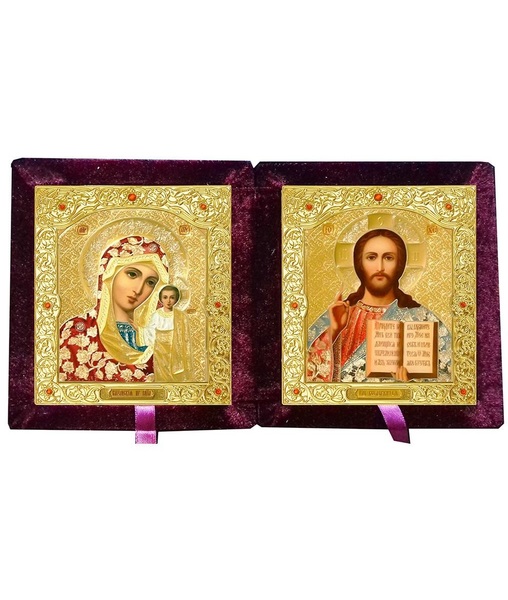 Бархатный складень вынимающийся лик 10х12 Софрино цветная одежда Б-22-3-Б с золотым окладом, замочком и вышитым крестиком по средине, 26х15х3 см