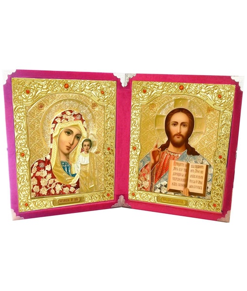 Бархатный складень вынимающийся лик 10х12 Софрино цветная одежда Б-22-К-3-К с коваными уголочками, золотым окладом, замочком и вышитым крестиком по средине, 26х15х3 см
