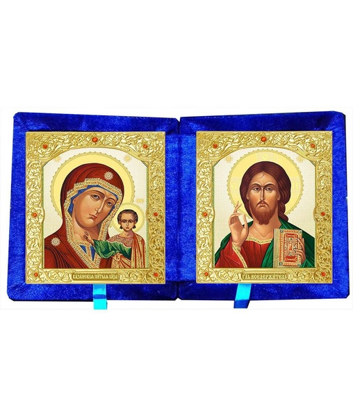 Бархатный складень вынимающийся лик 10х12 Византия Б-22-7-С с золотым окладом, замочком и вышитым крестиком по средине, 26х15х3 см