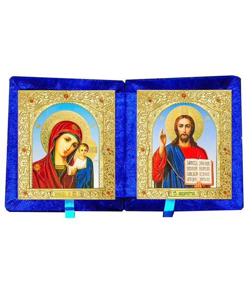 Бархатный складень вынимающийся лик 15х18 Софрино арочный Б-21-6-С с золотым окладом, замочком и вышитым крестиком по средине, 36х21х6 см