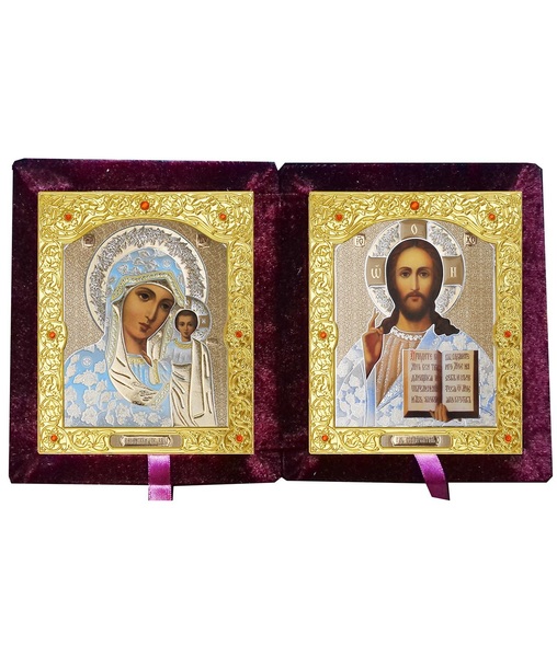 Бархатный складень вынимающийся лик 15х18 Софрино белая одежда Б-21-1-Б с золотым окладом, замочком и вышитым крестиком по средине, 36х21х6 см