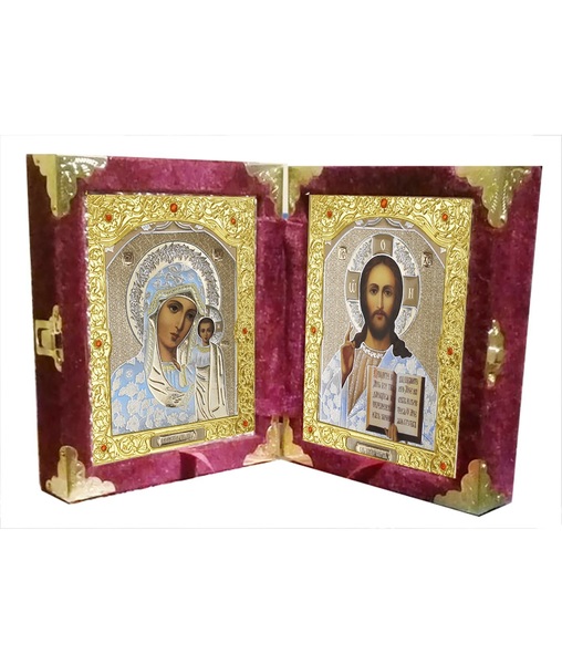 Бархатный складень вынимающийся лик 15х18 Софрино белая одежда Б-21-К-1-Б с коваными уголочками, золотым окладом, замочком и вышитым крестиком по средине, 36х21х6 см